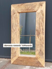 Grote robuuste spiegel van hardhouten wagonplanken afm 139 x 57 lijst 10,5 cm