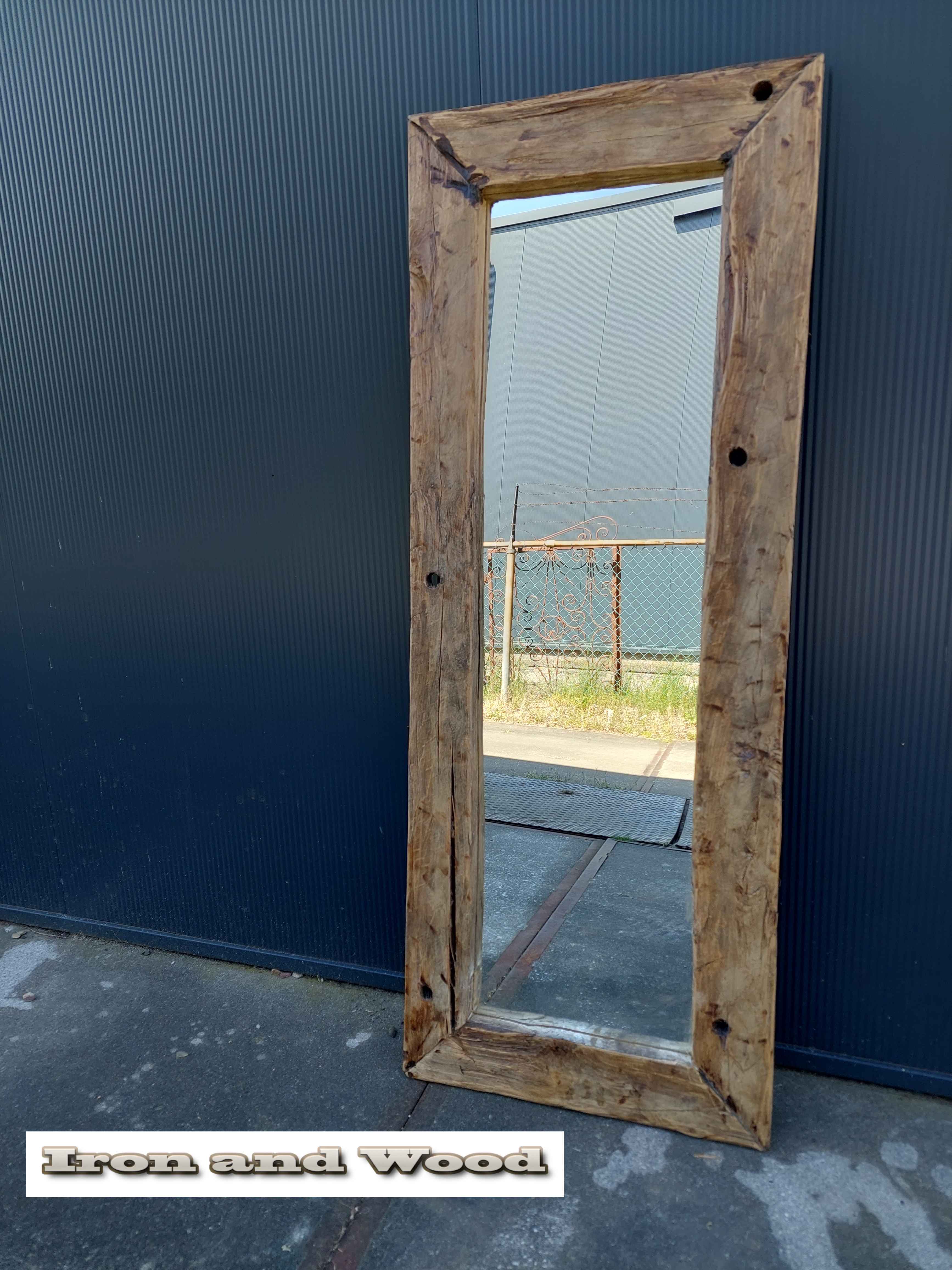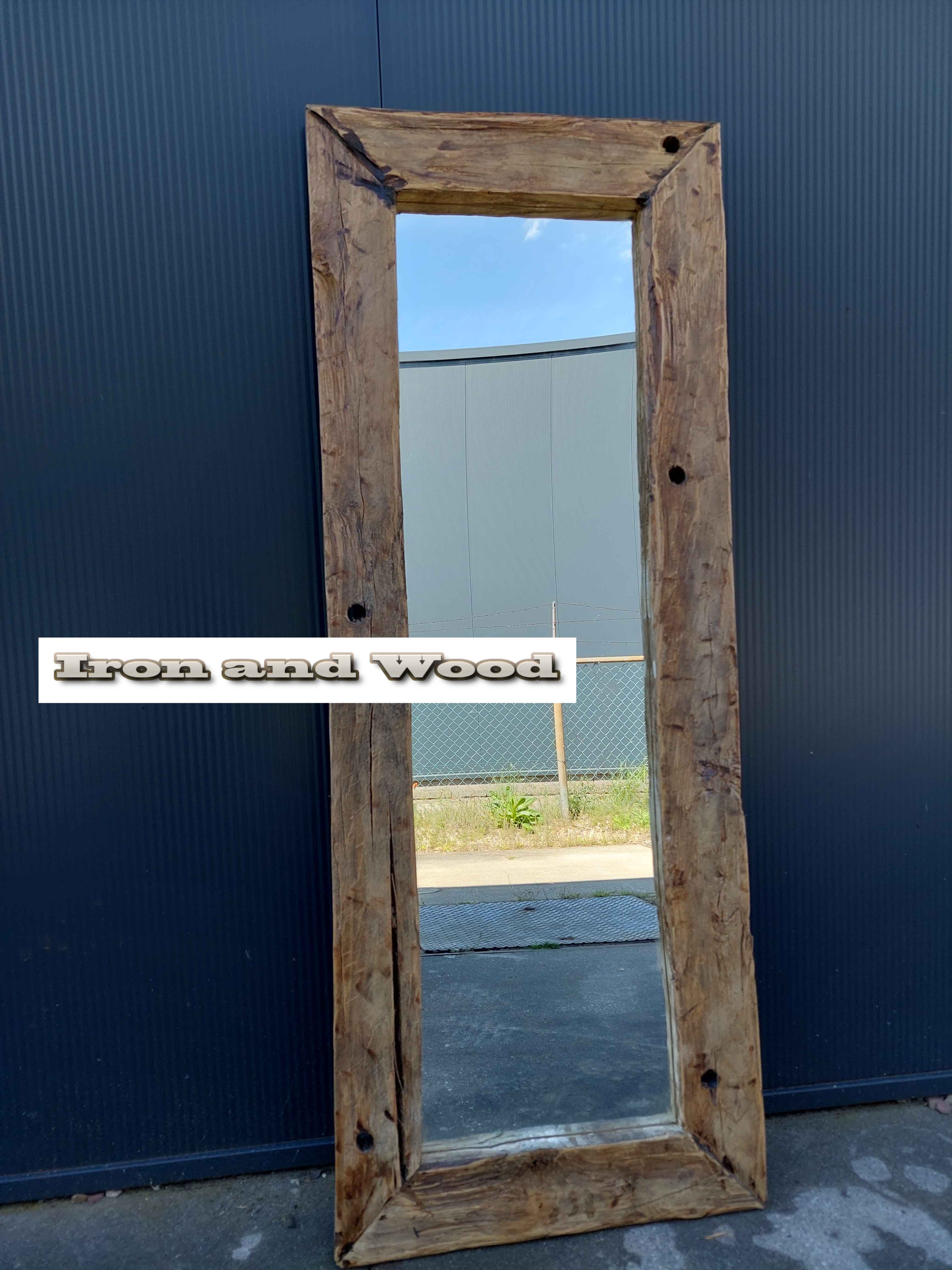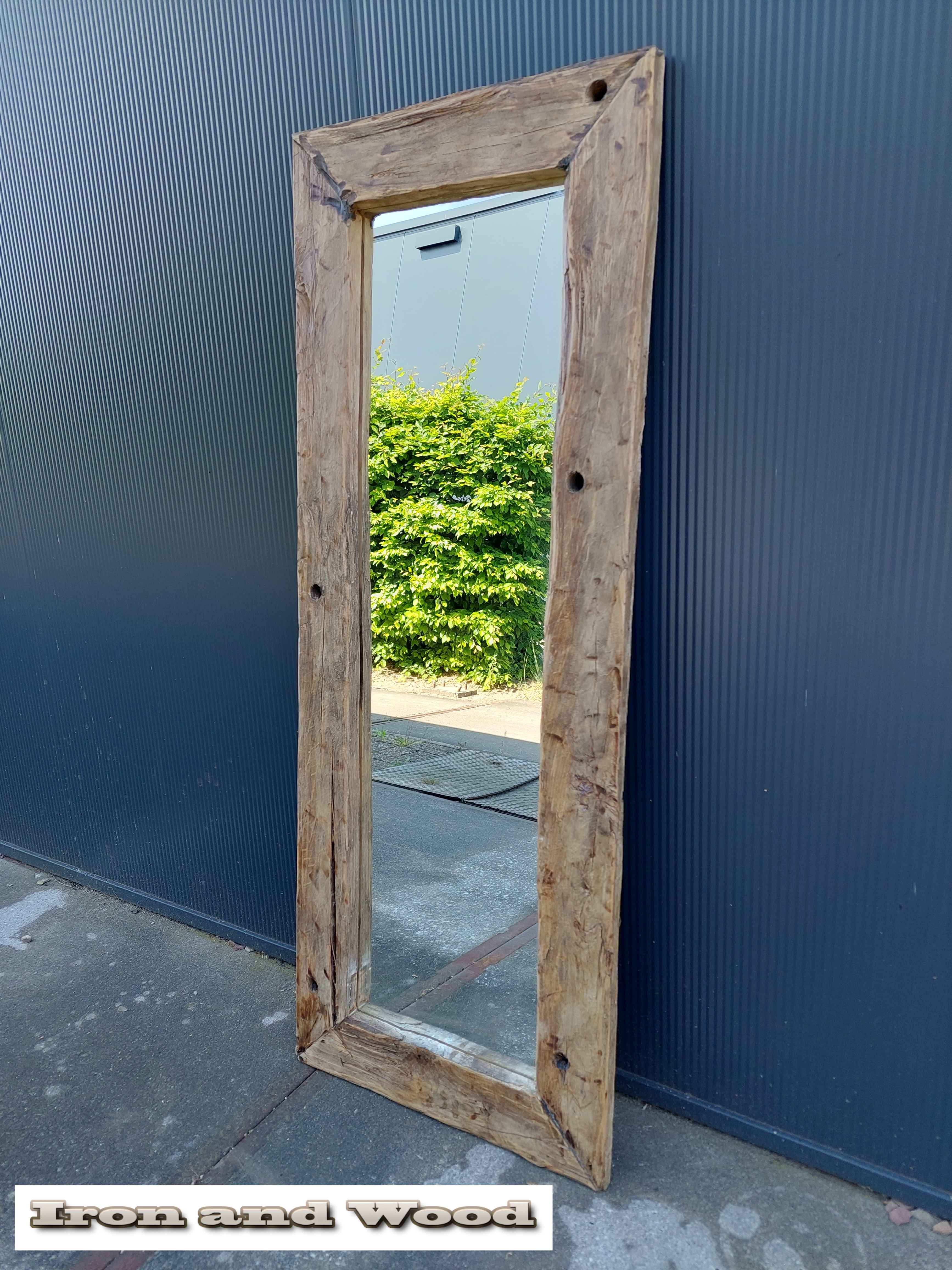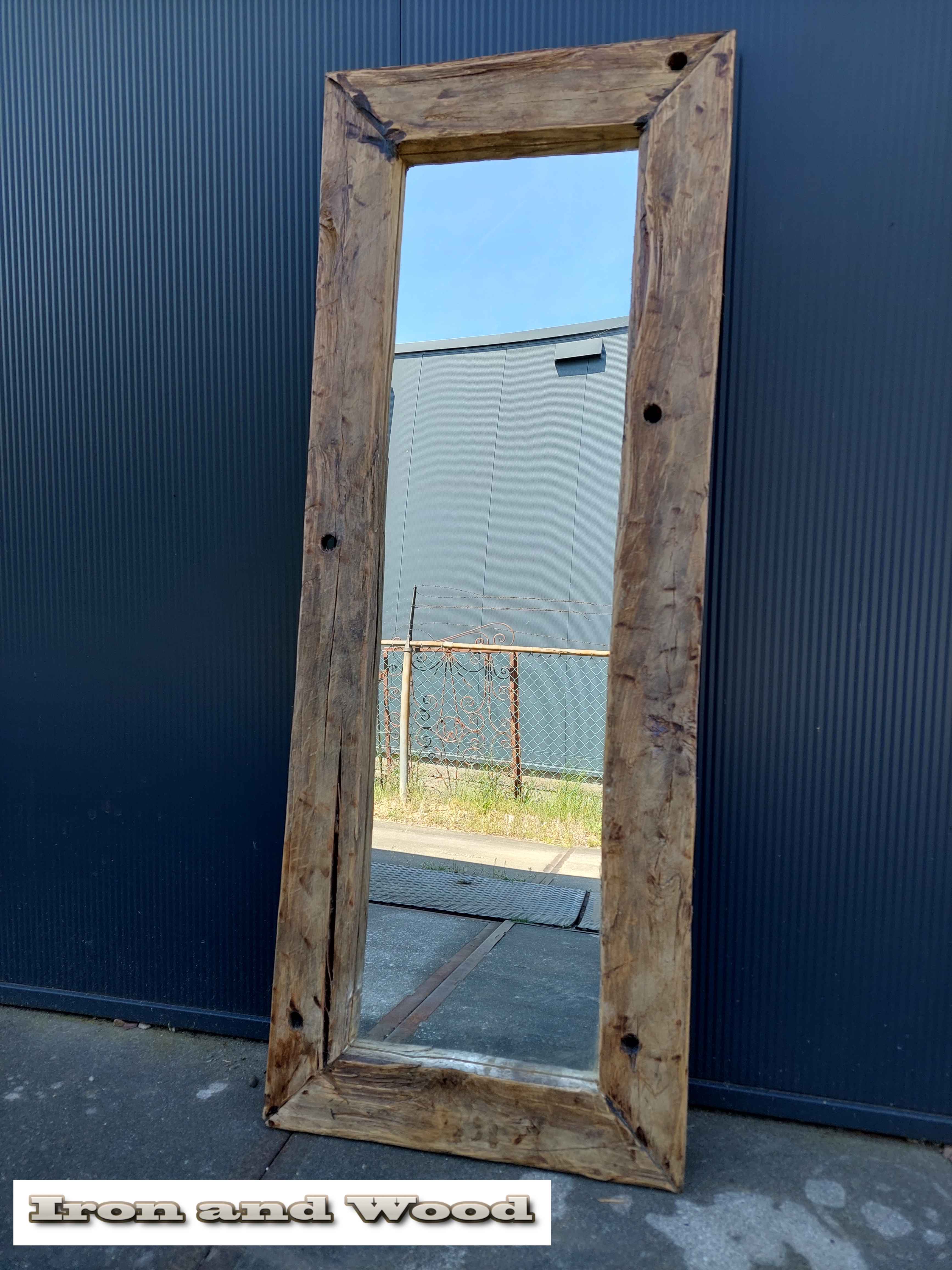 Grote robuuste spiegel van oude eiken wagondelen/ wagonplanken. Handgemaakte spiegel afgewerkt met blanke lak.