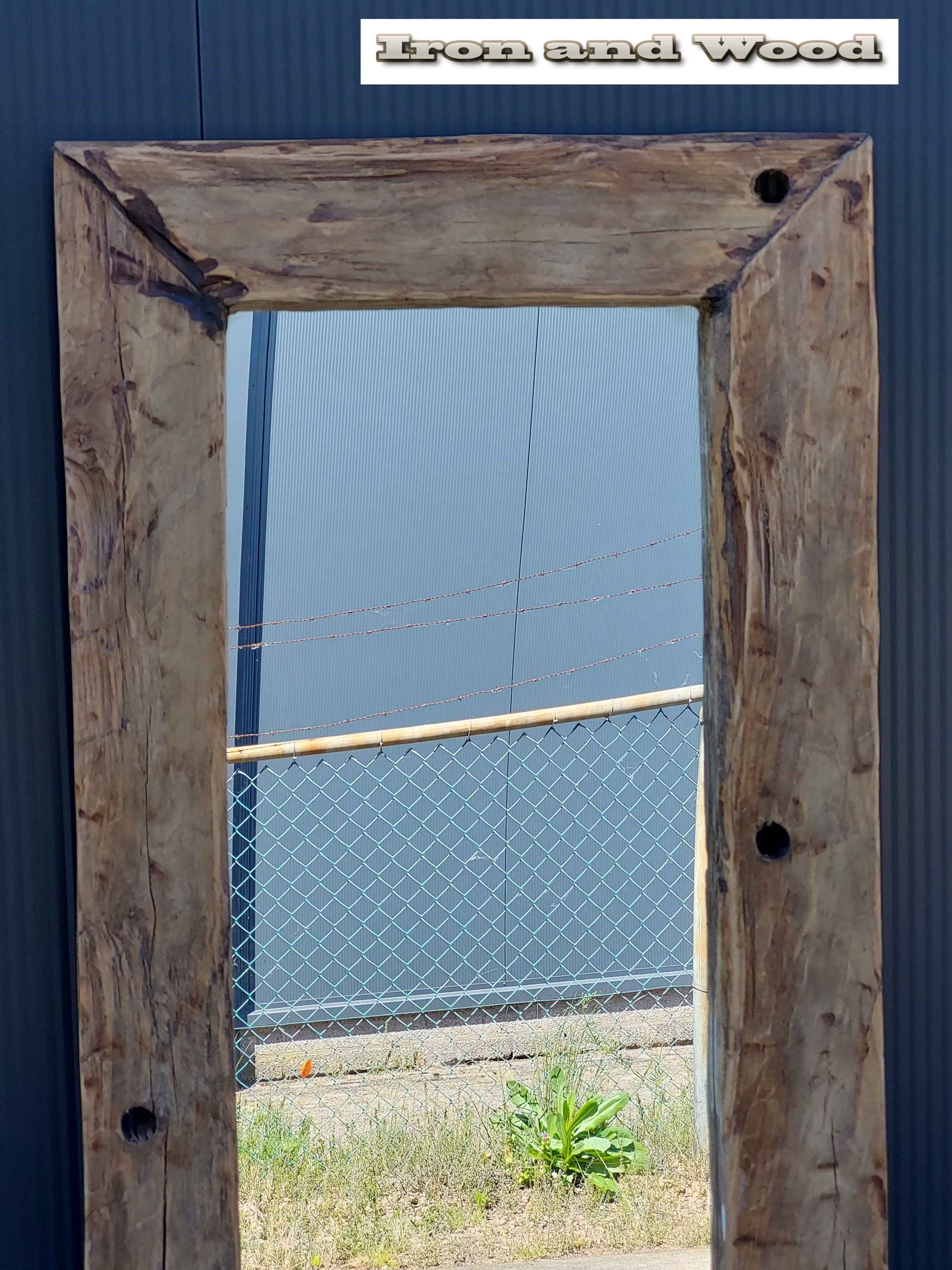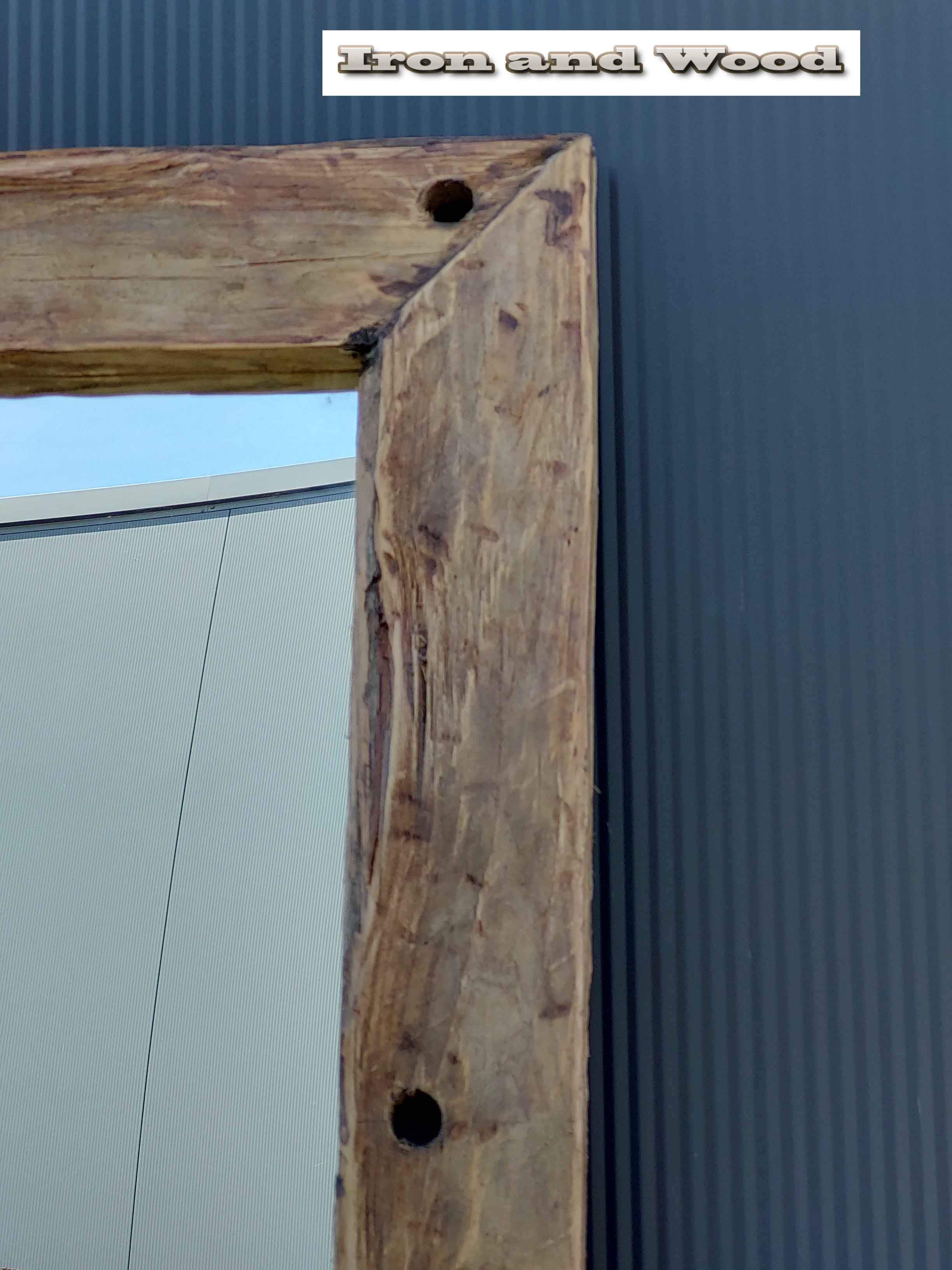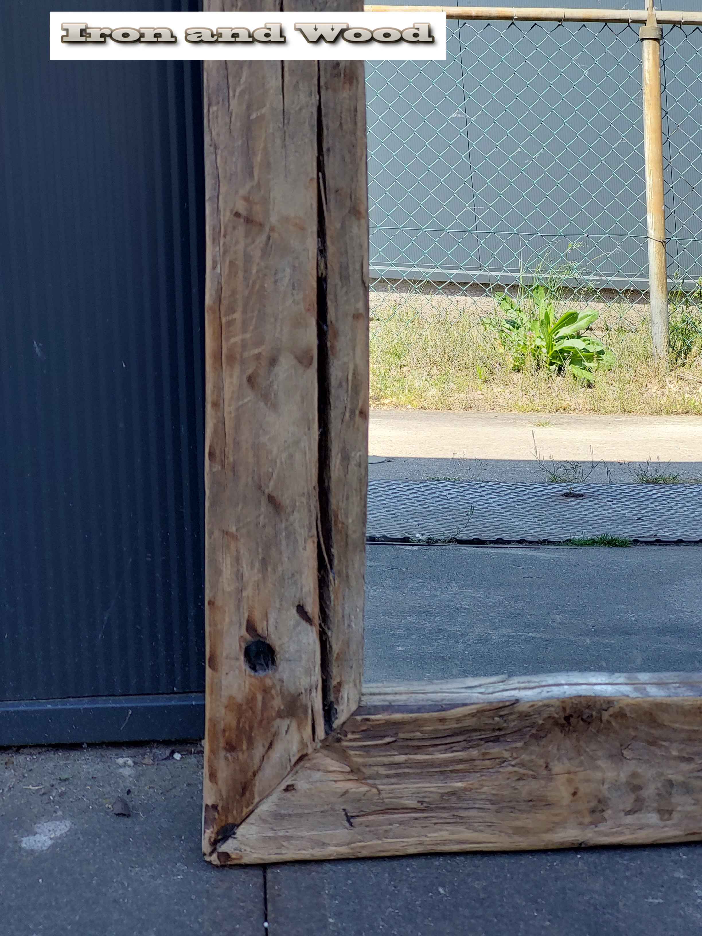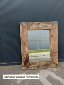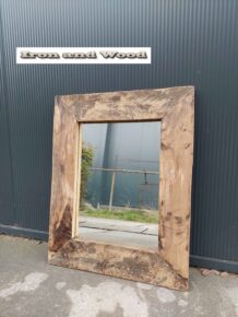 Grote robuuste spiegel van oude eiken wagondelen/ wagonplanken. Handgemaakte spiegel afgewerkt met blanke lak.