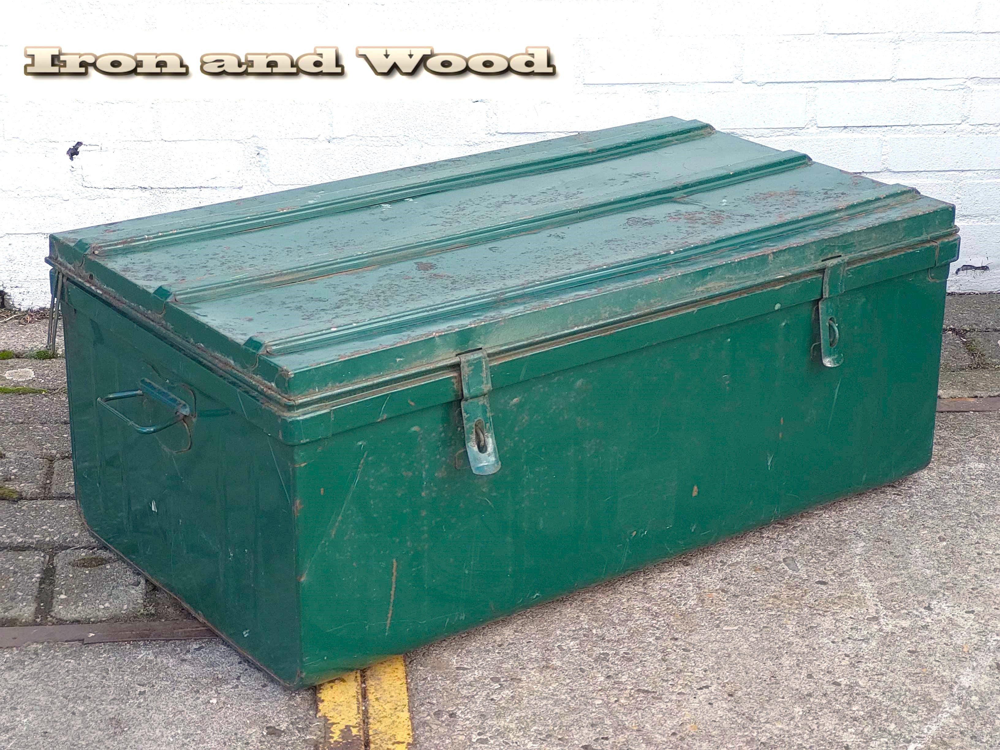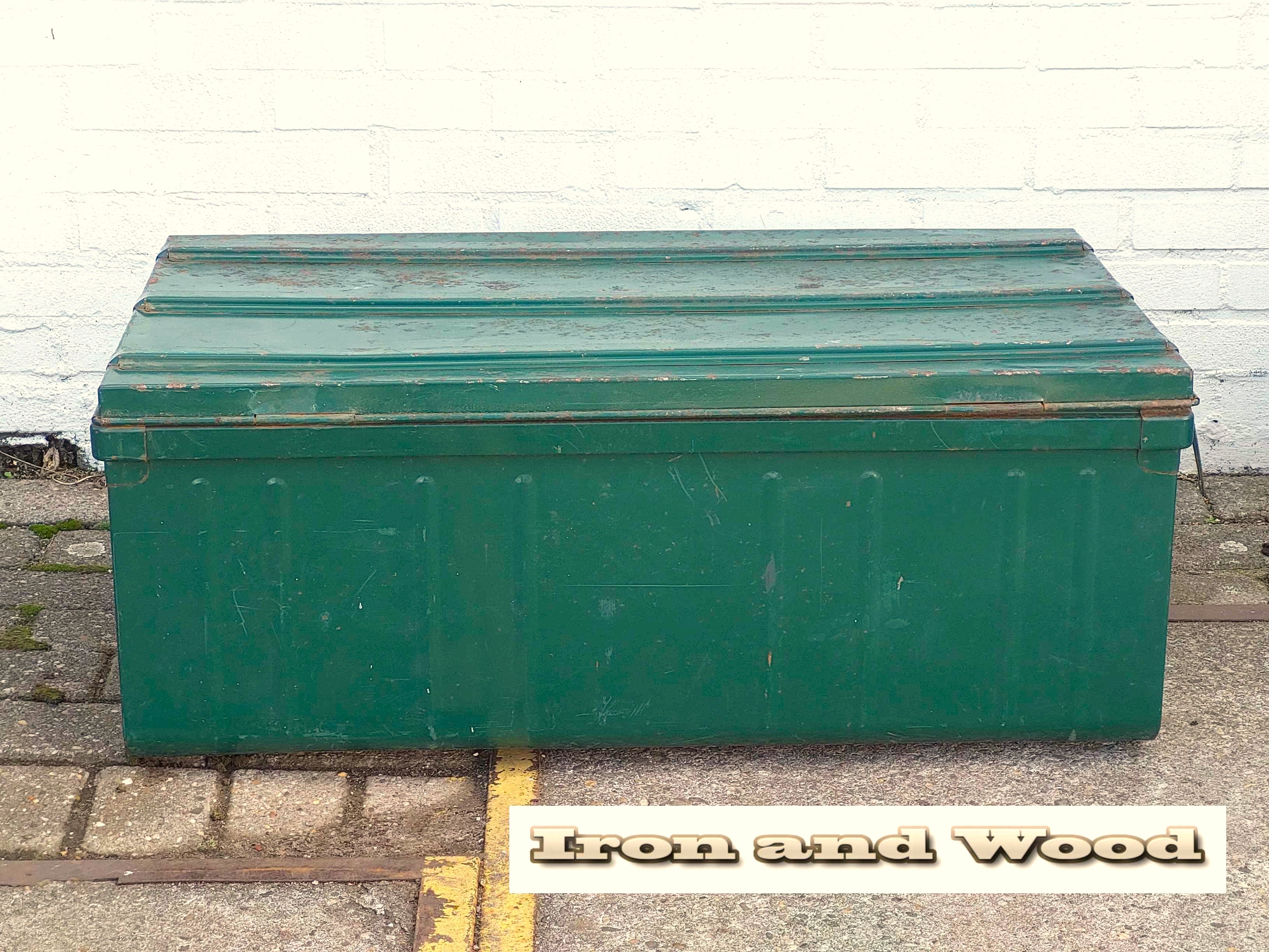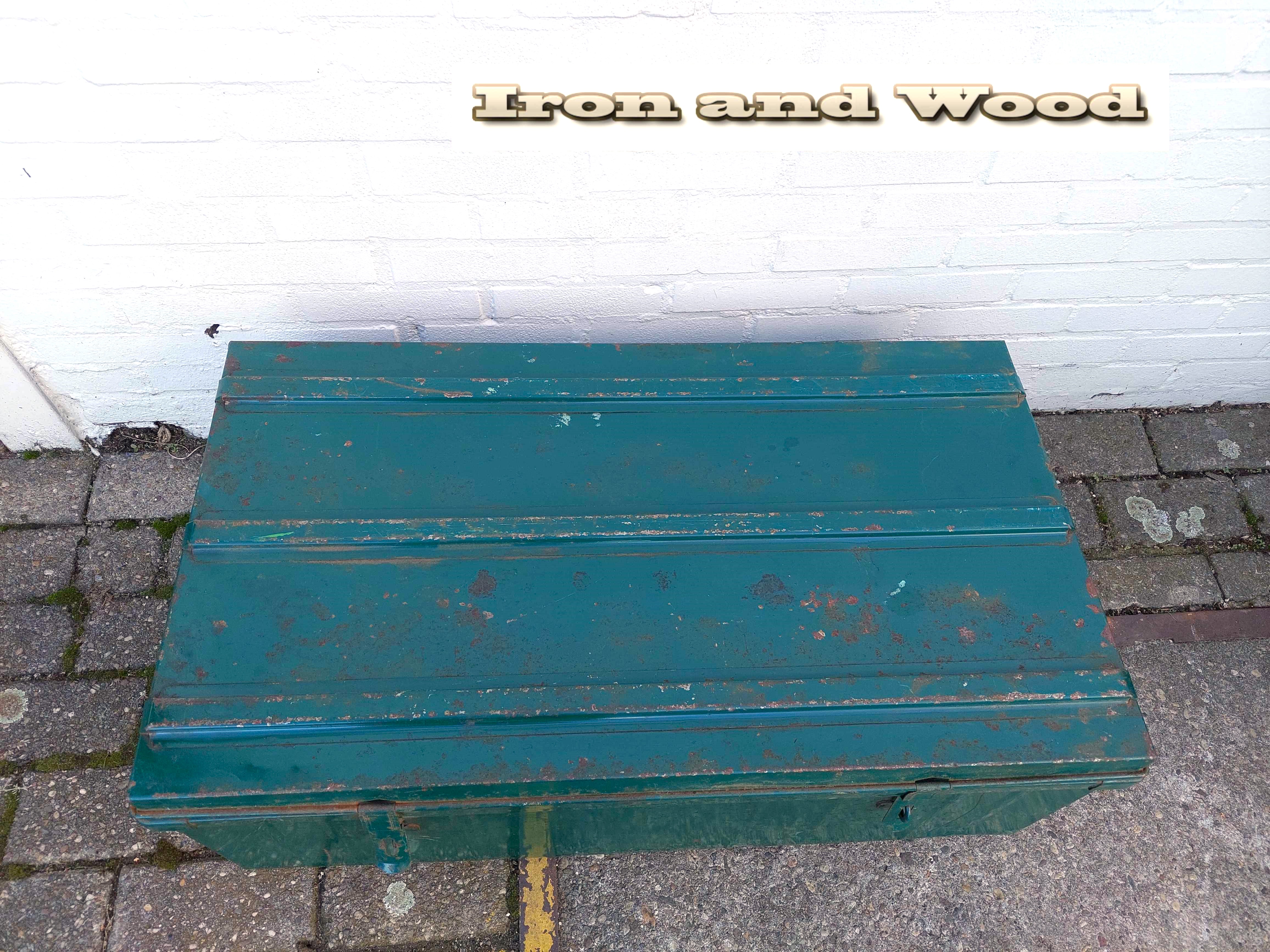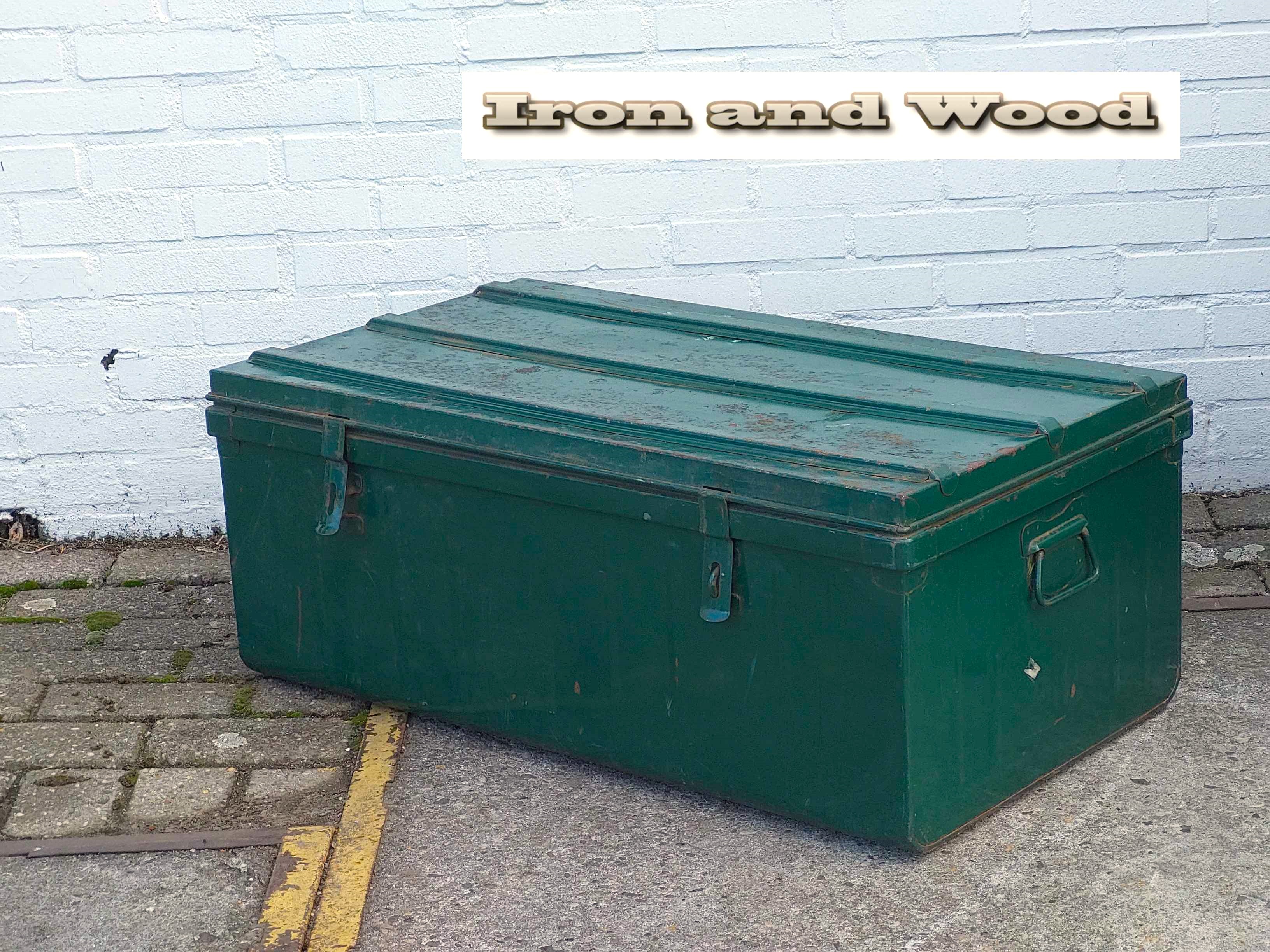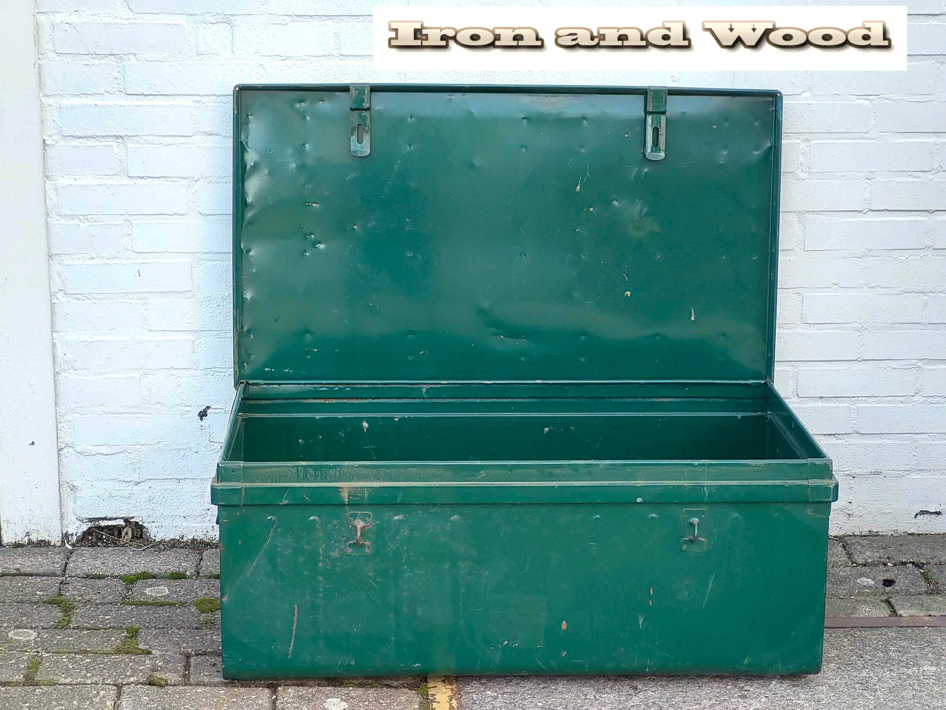 Stalen industriele oude grote groene kist / dekenkist afm 87 x 49 x 35 . De kist is authentieke staat en heeft de nodige gebruikssporen.