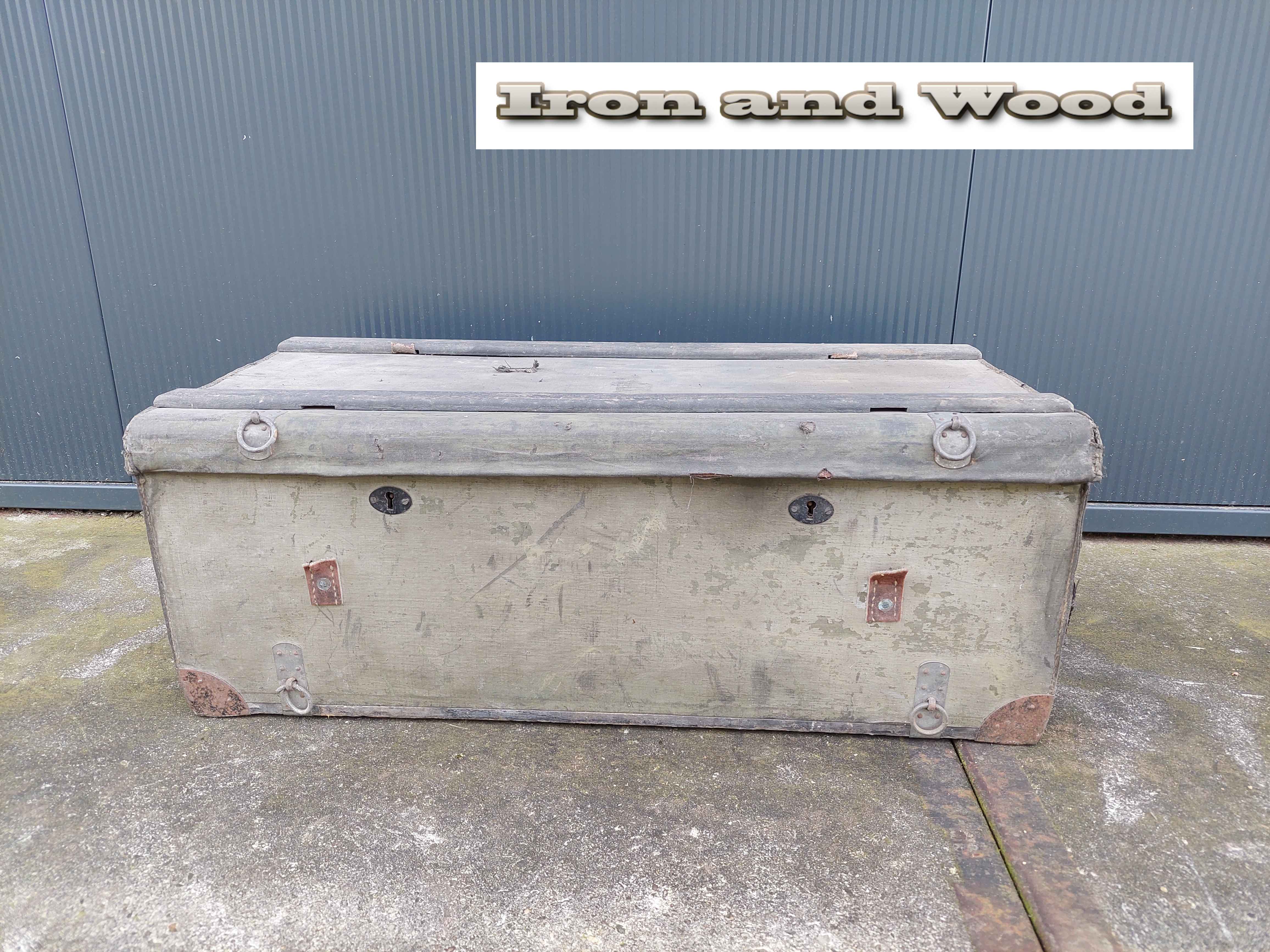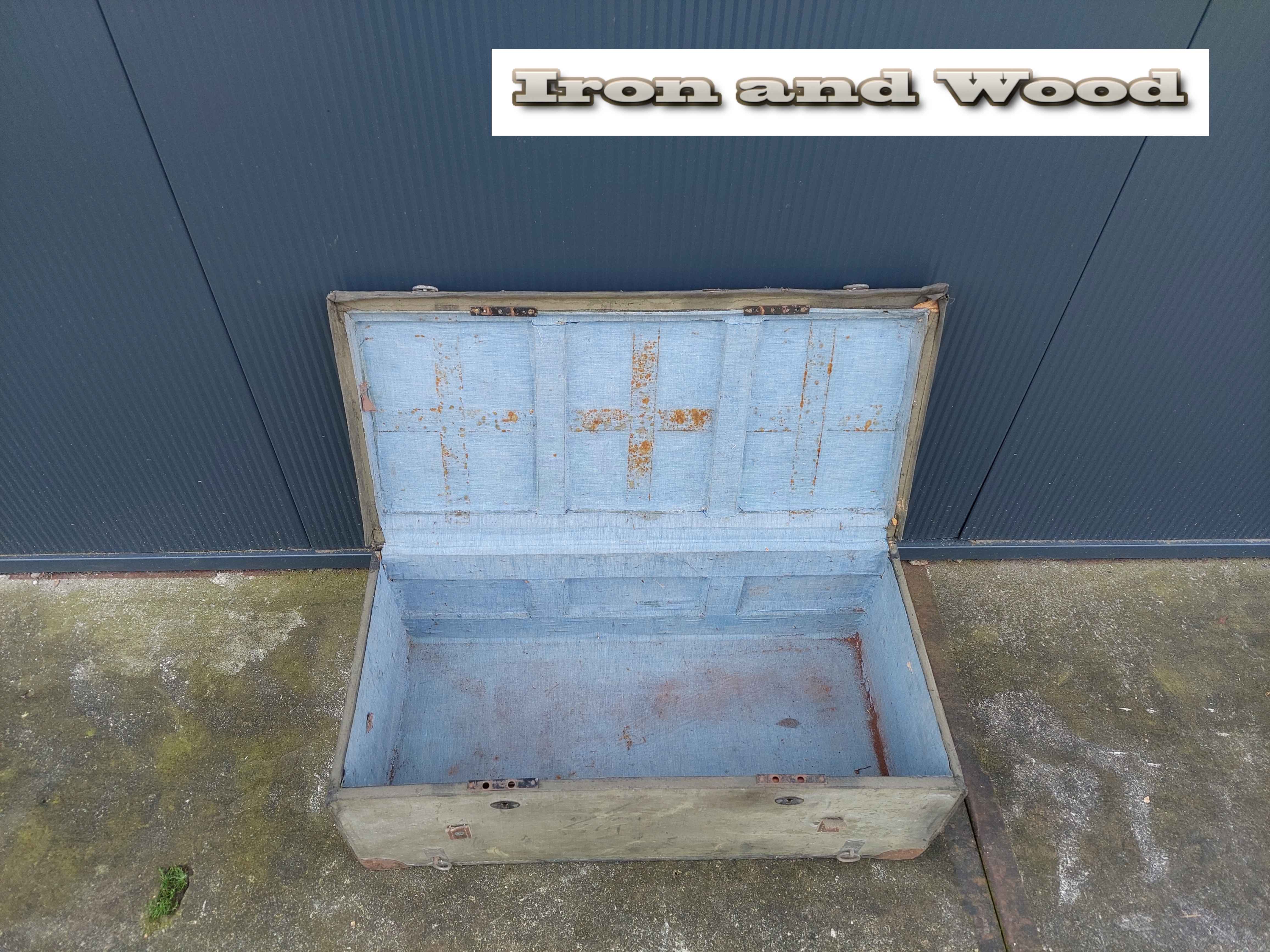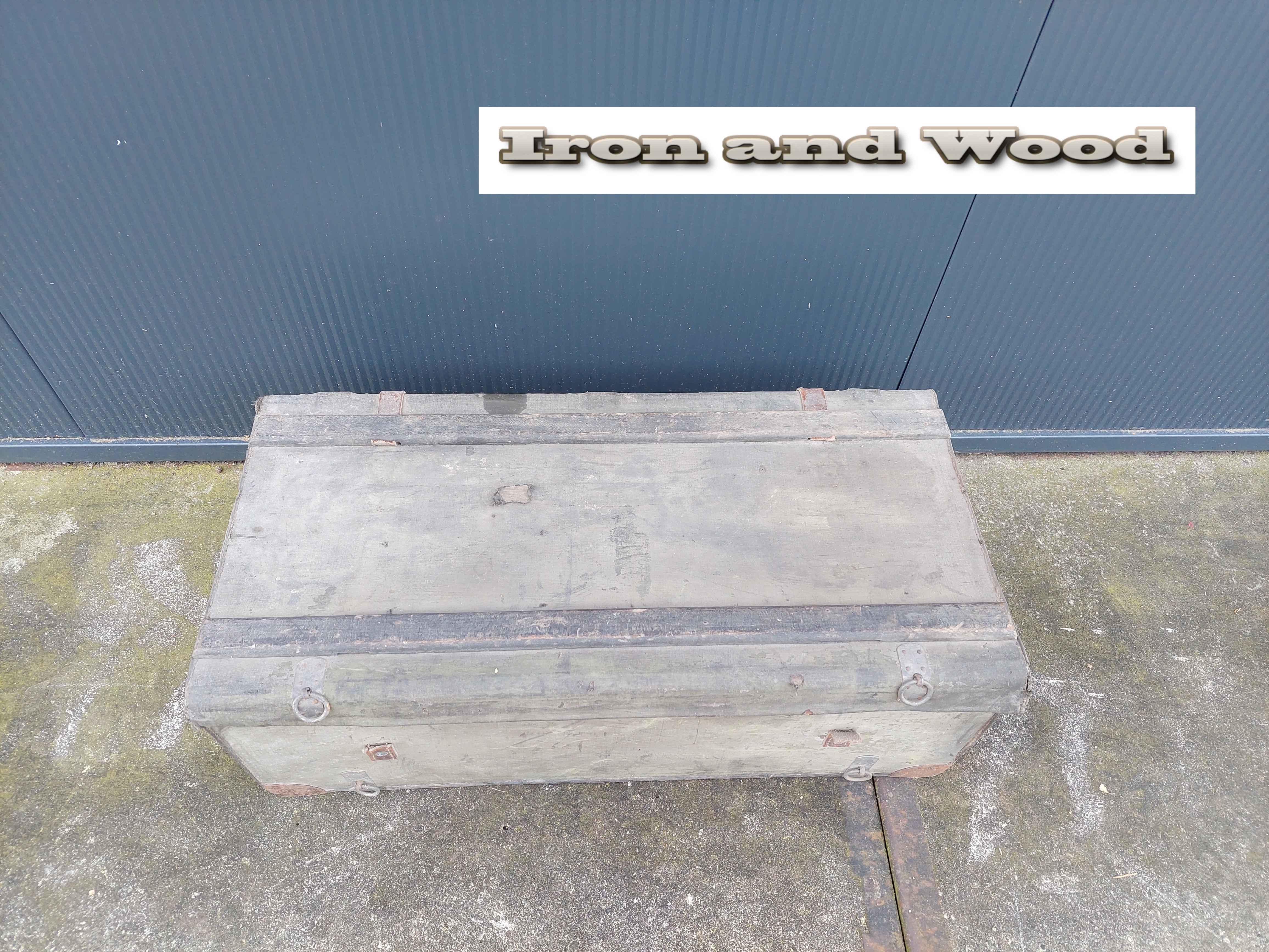 Vintage groen/ grijze oude hutkoffer / kist afm. 69 x 35 x 27 cm. De kist is in authentieke staat en heeft gebruikssporen!