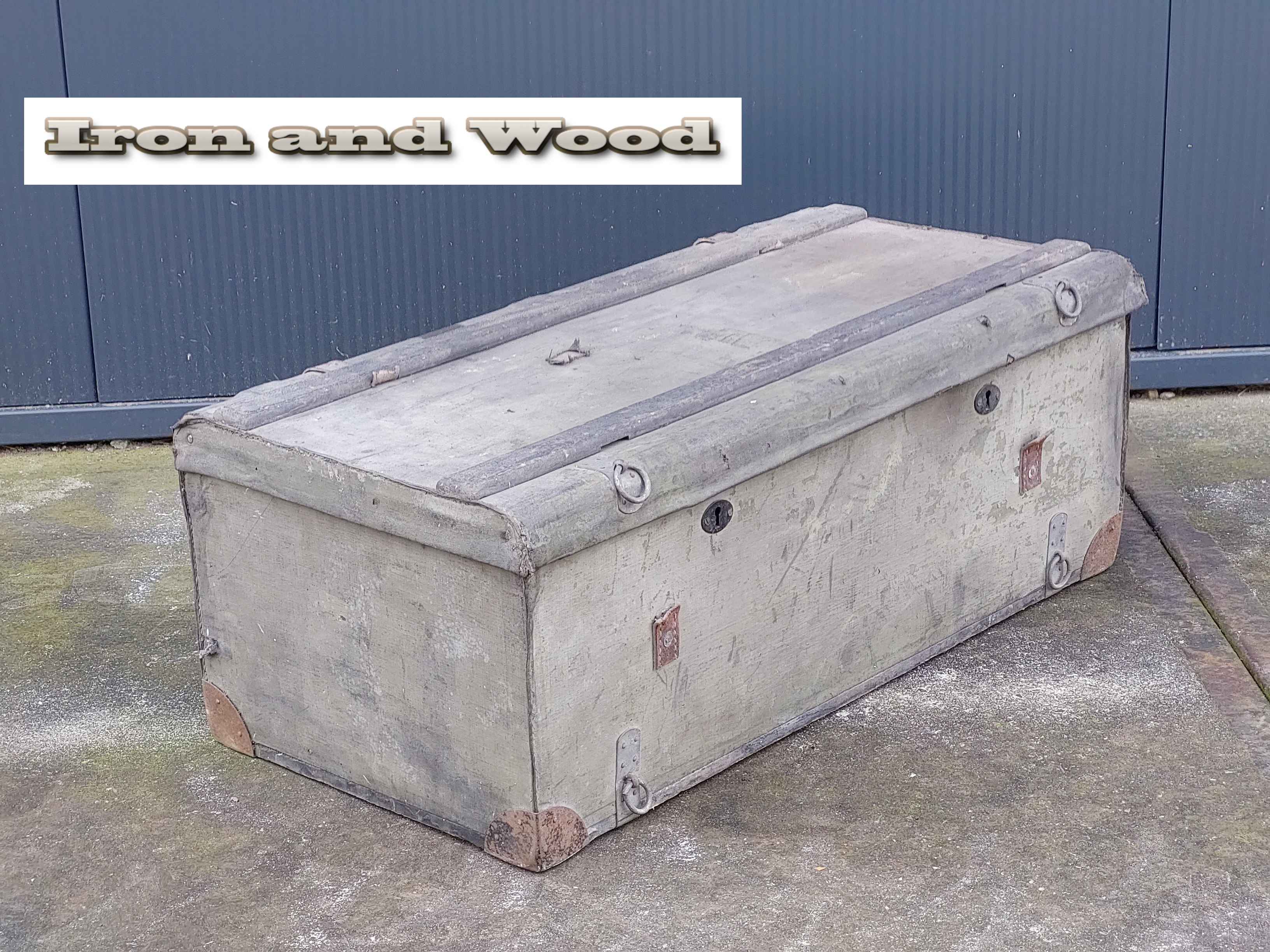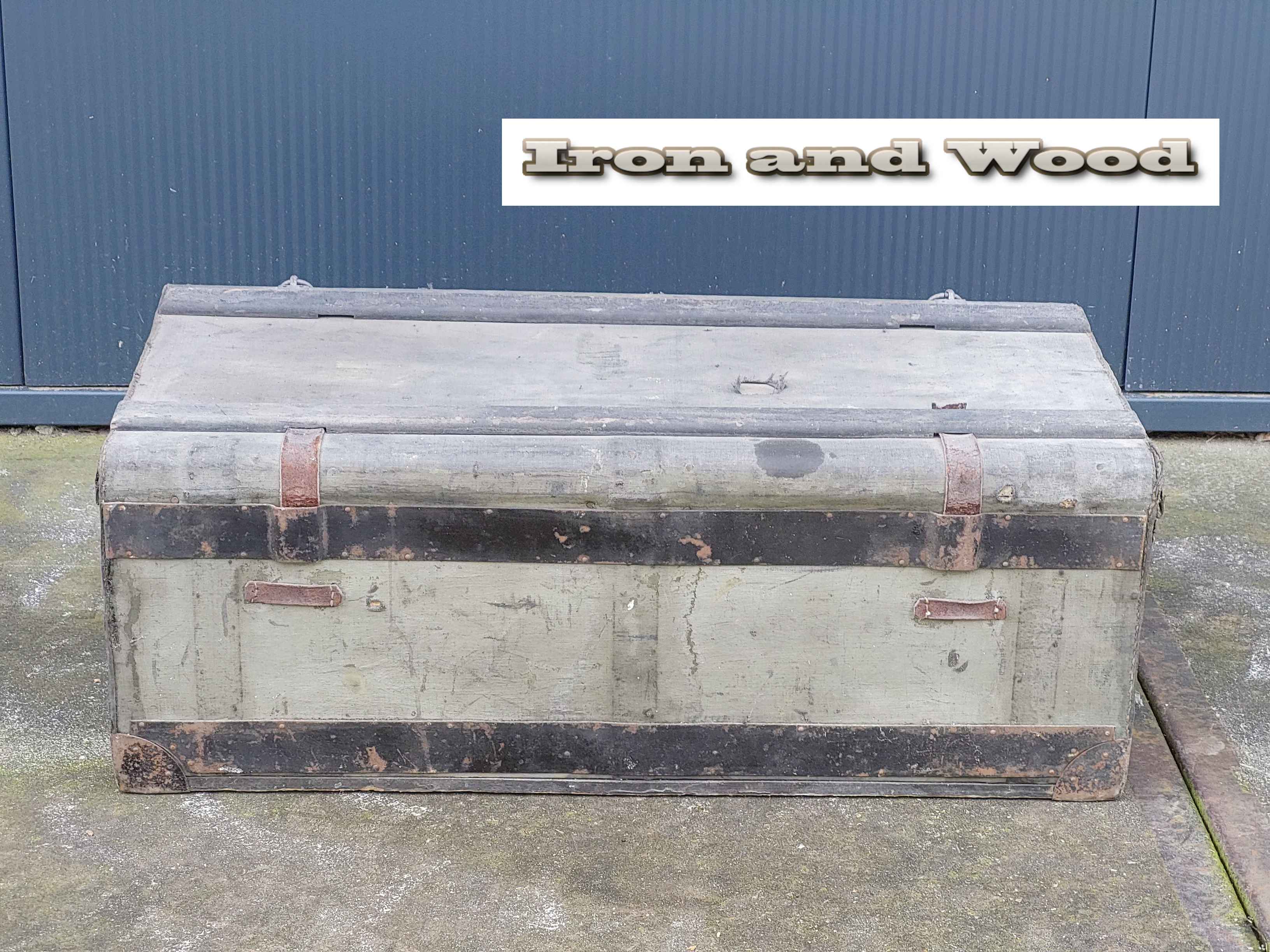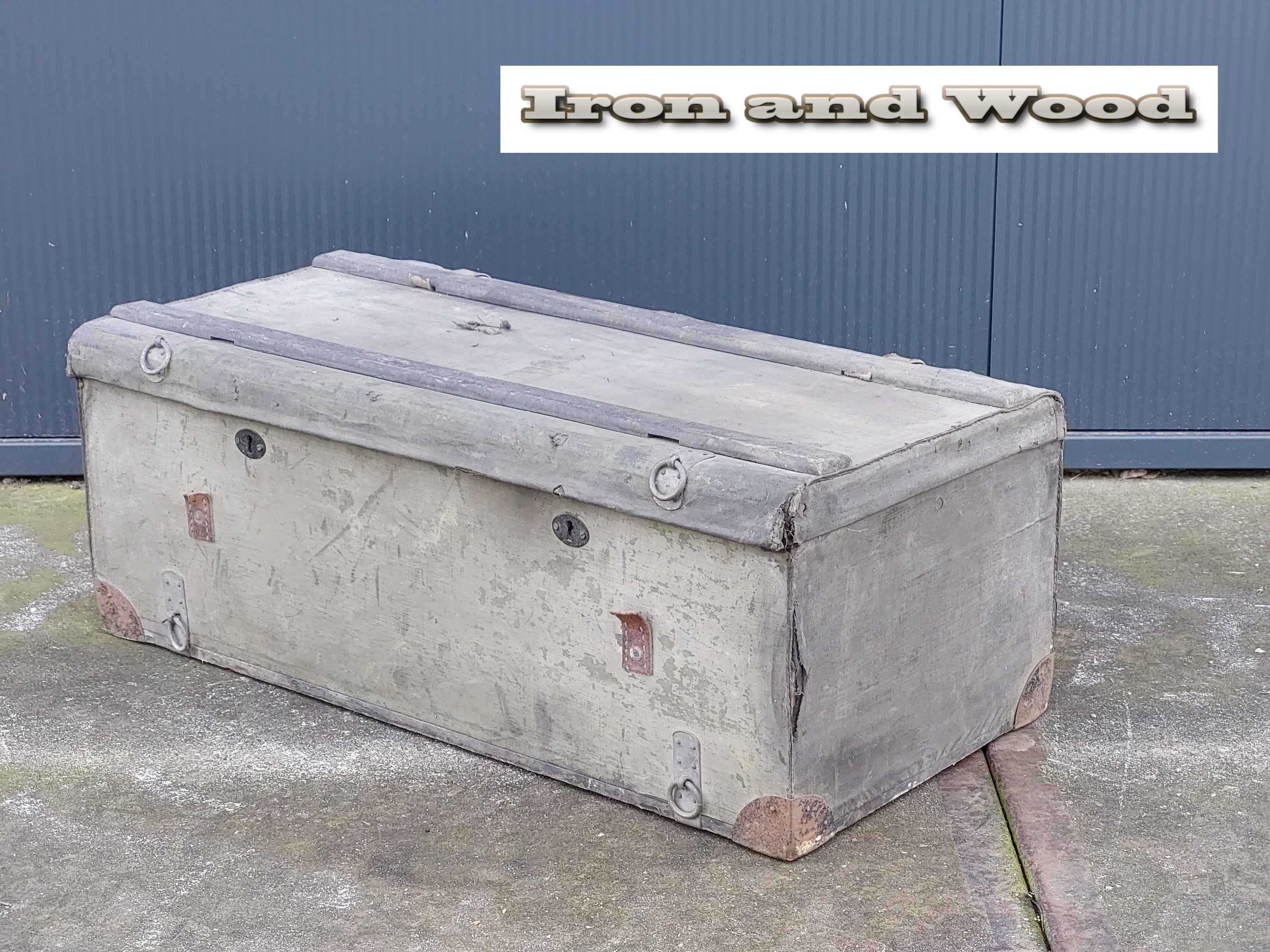 Vintage groen/ grijze oude hutkoffer / kist afm. 69 x 35 x 27 cm. De kist is in authentieke staat en heeft gebruikssporen!