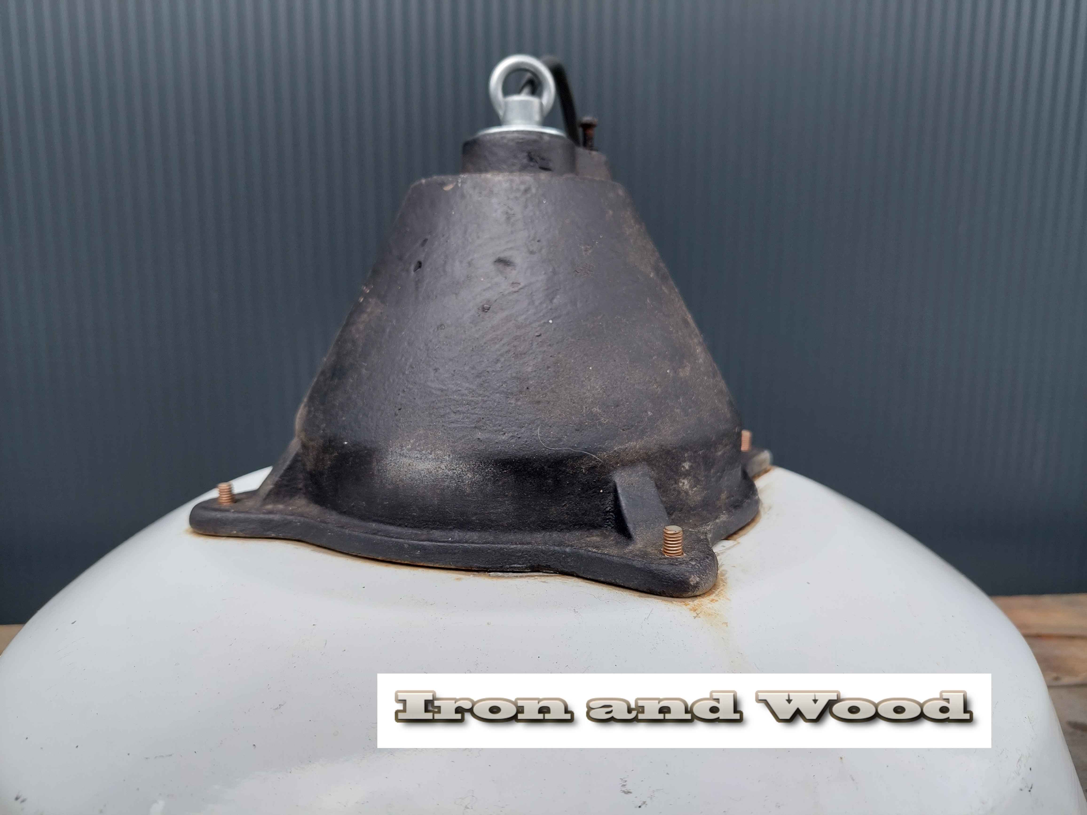 Oude witte vintage emaille lamp met smeedijzeren bovenzijde. De lamp is in authentieke staat en heeft lichte gebruikssporen.